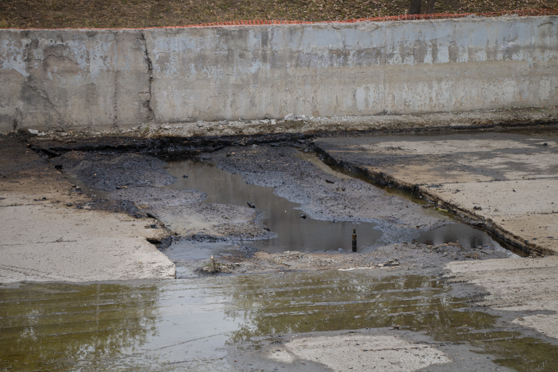 Парапет, отделяющий пешеходную часть от канала, частично разрушен. Строительный мусор остался лежать рядом. При этом периодически здесь ходят горожане.