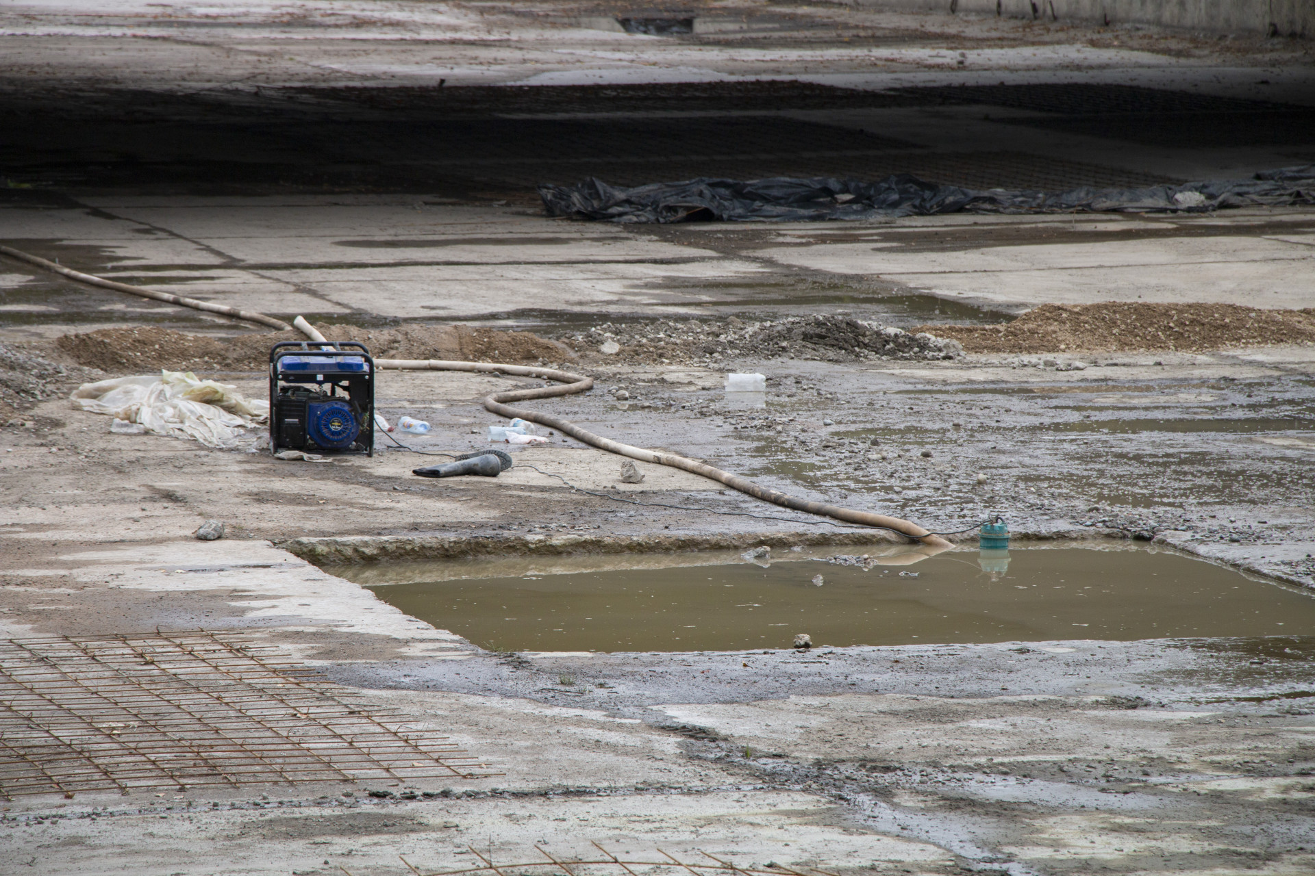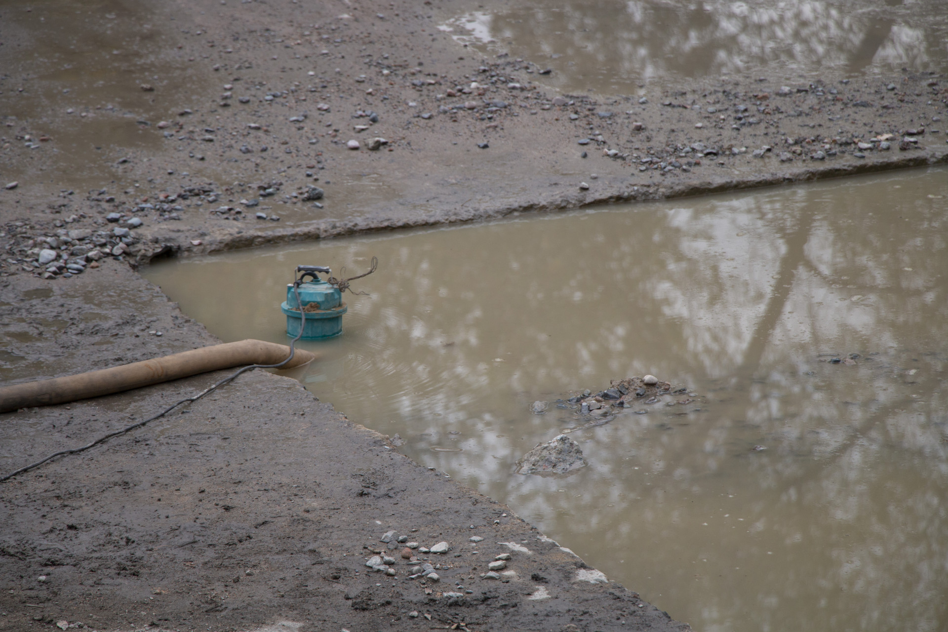 За улицей Жансугурова на момент съёмки репортажа работы не велись. Картина похожая: демонтированные бетонные плиты и подтопления.