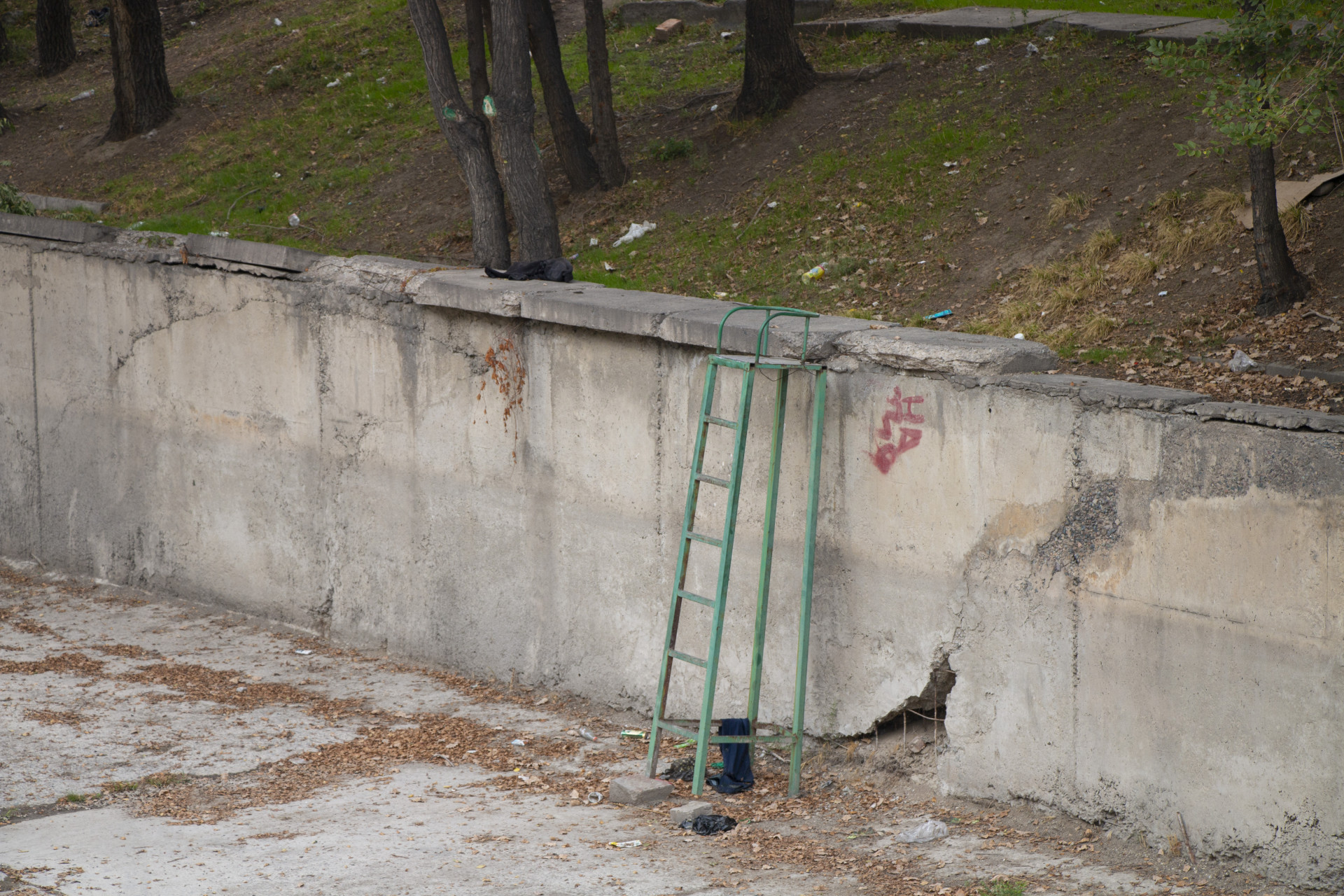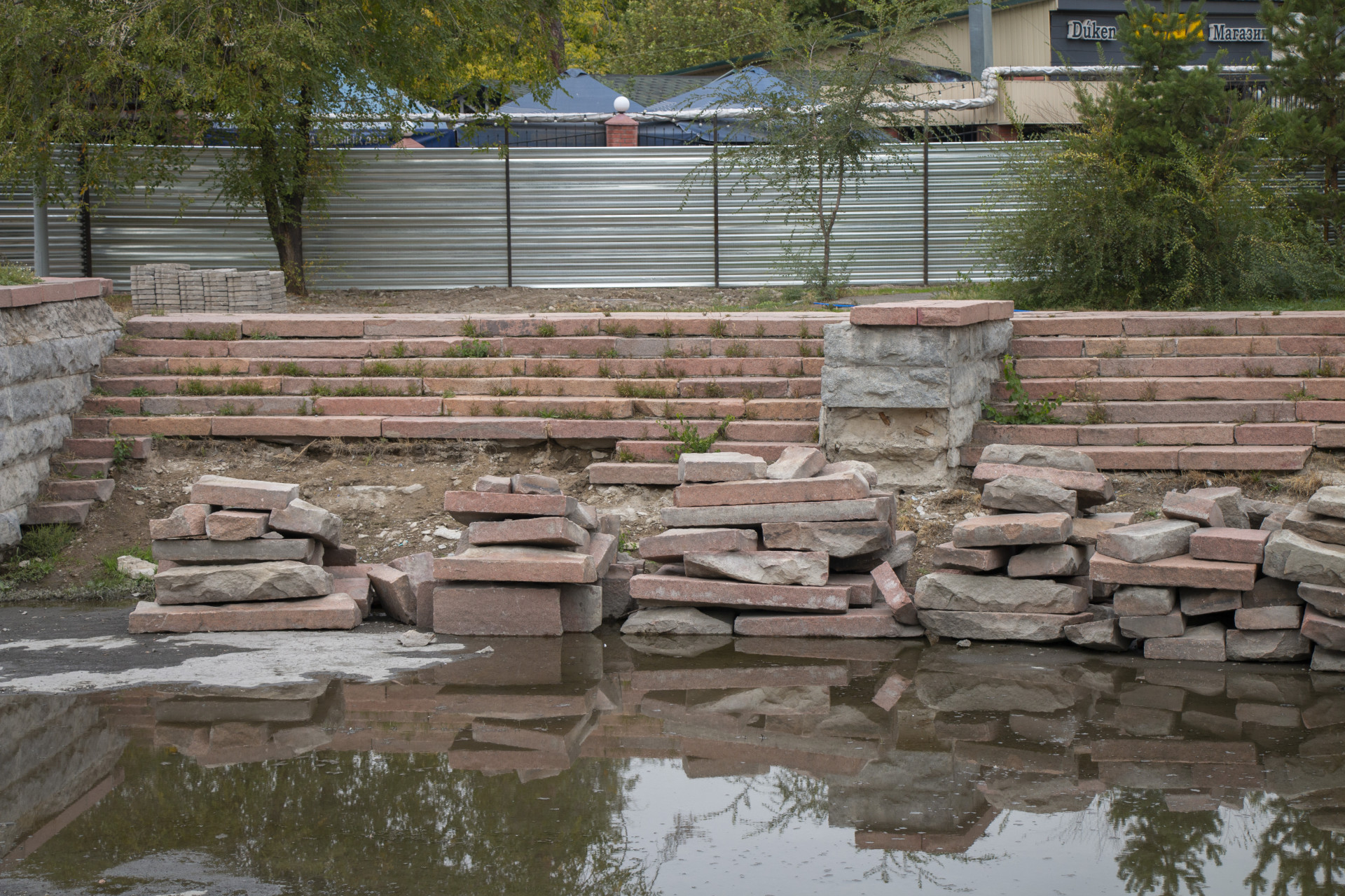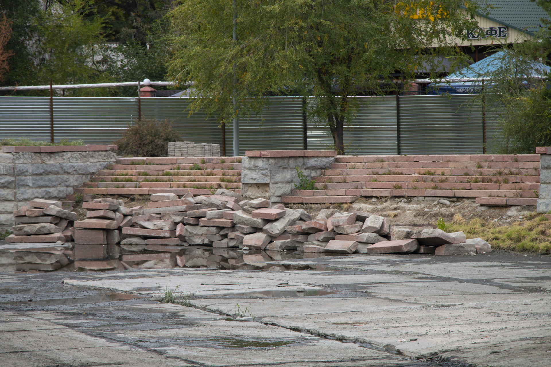 Ближе к проспекту Сейфуллина можно заметить старые гранитные ступени. Сейчас они частично разобраны и сложены друг на друга. Если держать в голове историю с гранитными плитами на Большой Алматинке, то будущее этого гранита пока остается весьма туманным.