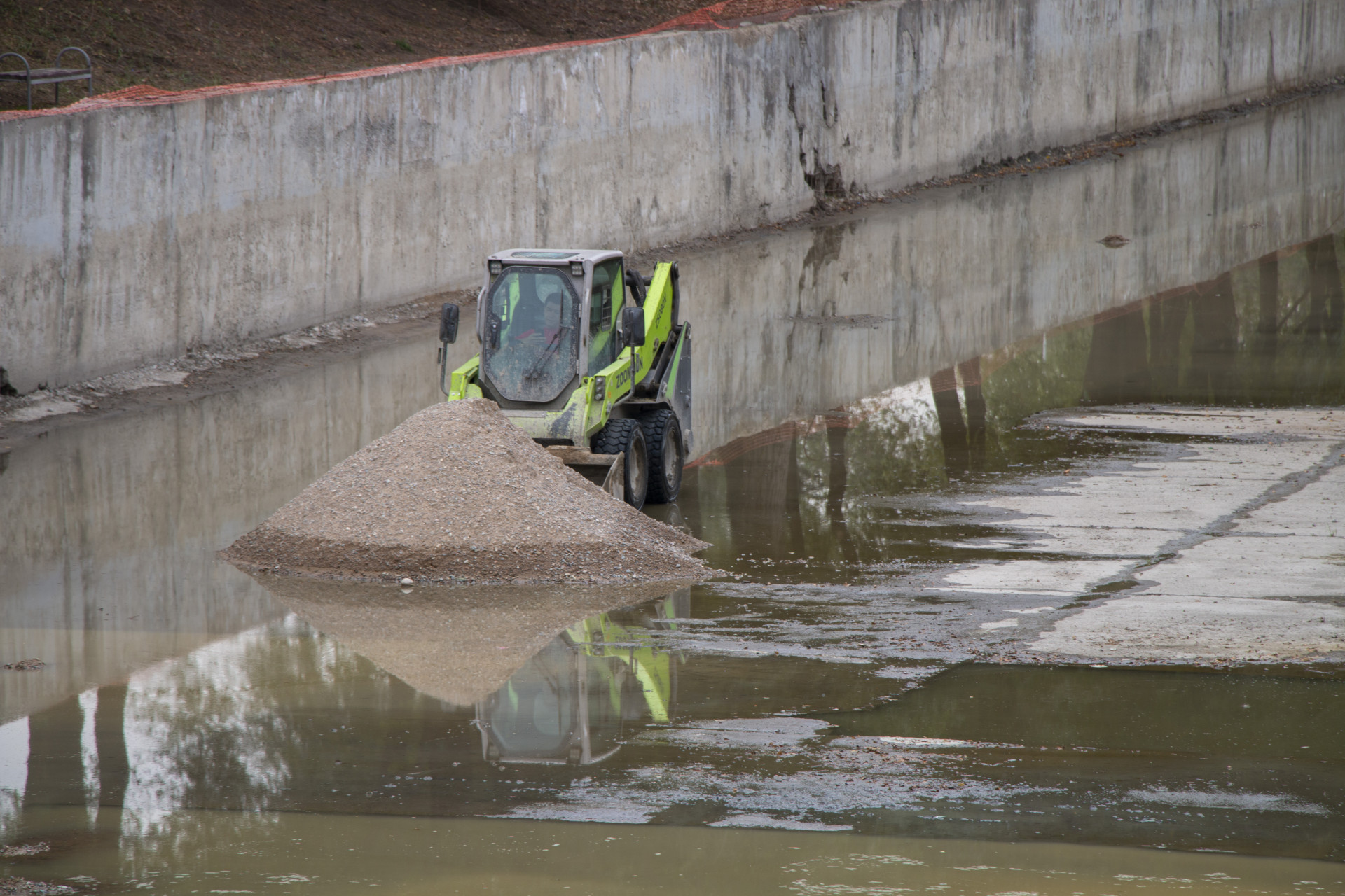 Отдельные участки затоплены больше других. В воде также остался небольшой погрузчик.
