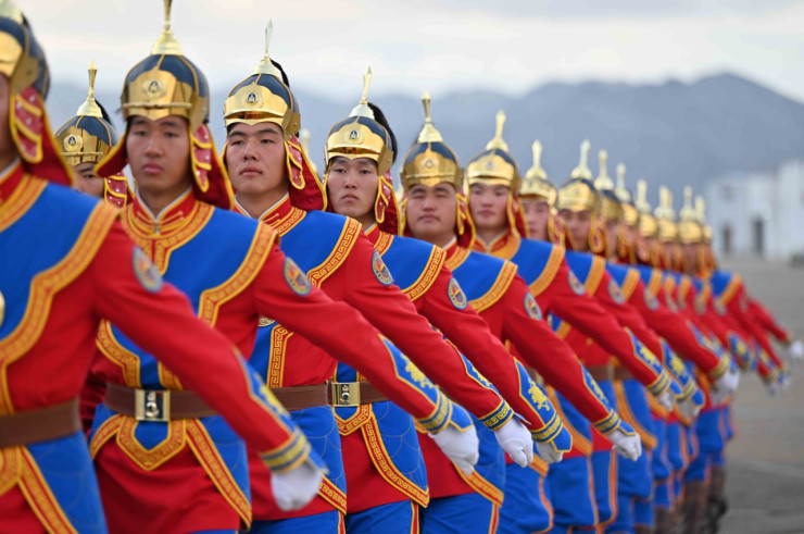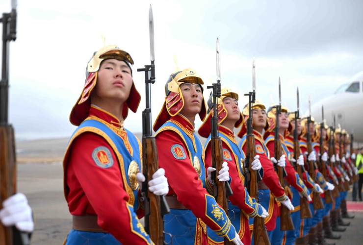У трапа Главу государства встречал почетный караул монгольских вооруженных сил. Солдаты были одеты в красно-синие кафтаны, стилизованные под одеяние личной гвардии Чингисхана. На голове у военнослужащих были шлемы, также характерные для тех времен. При этом в руках у них было не средневековое оружие, а советские самозарядные карабины Симонова.