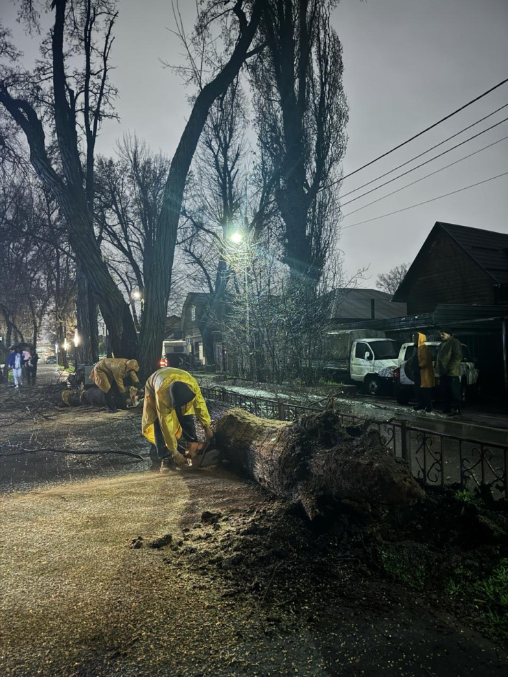 В акимате Алматы сообщили, что к настоящему моменту последствия непогоды - обильных осадков и шквального ветра - в городе были устранены. Всего за ночь в городе упало 26 деревьев. До утра 29 марта все участки расчищены, упавшие деревья распилены и вывезены.
