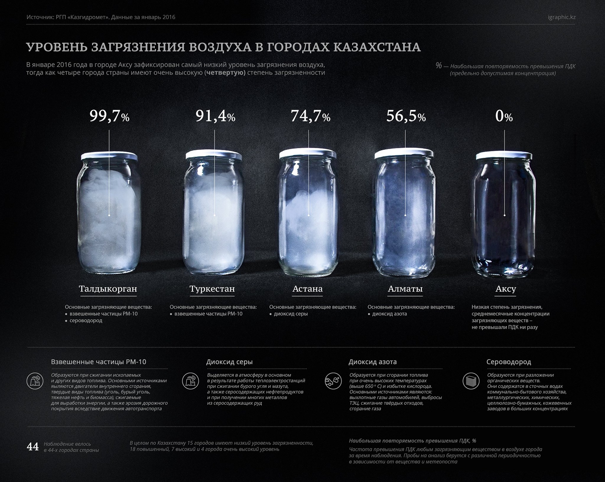 "В основе - наибольшая повторяемость превышения уровня предельно-допустимой концентрации (ПДК). Метеостанции или метеопосты "Казгидромета" с различной периодичностью (например, каждые 20 минут или 3 раза в сутки - в зависимости от анализируемого вещества) осуществляют замеры содержания вредных веществ в атмосфере. Зачастую эти вещества превышают ПДК почти всегда или, например, только днем. Все данные собираются и высчитывается повторяемость превышения за месяц. Например, 99,7 процента показывает, что каждый день какое-либо вредное вещество в воздухе превышало норму", - говорится в пояснении к инфографике.