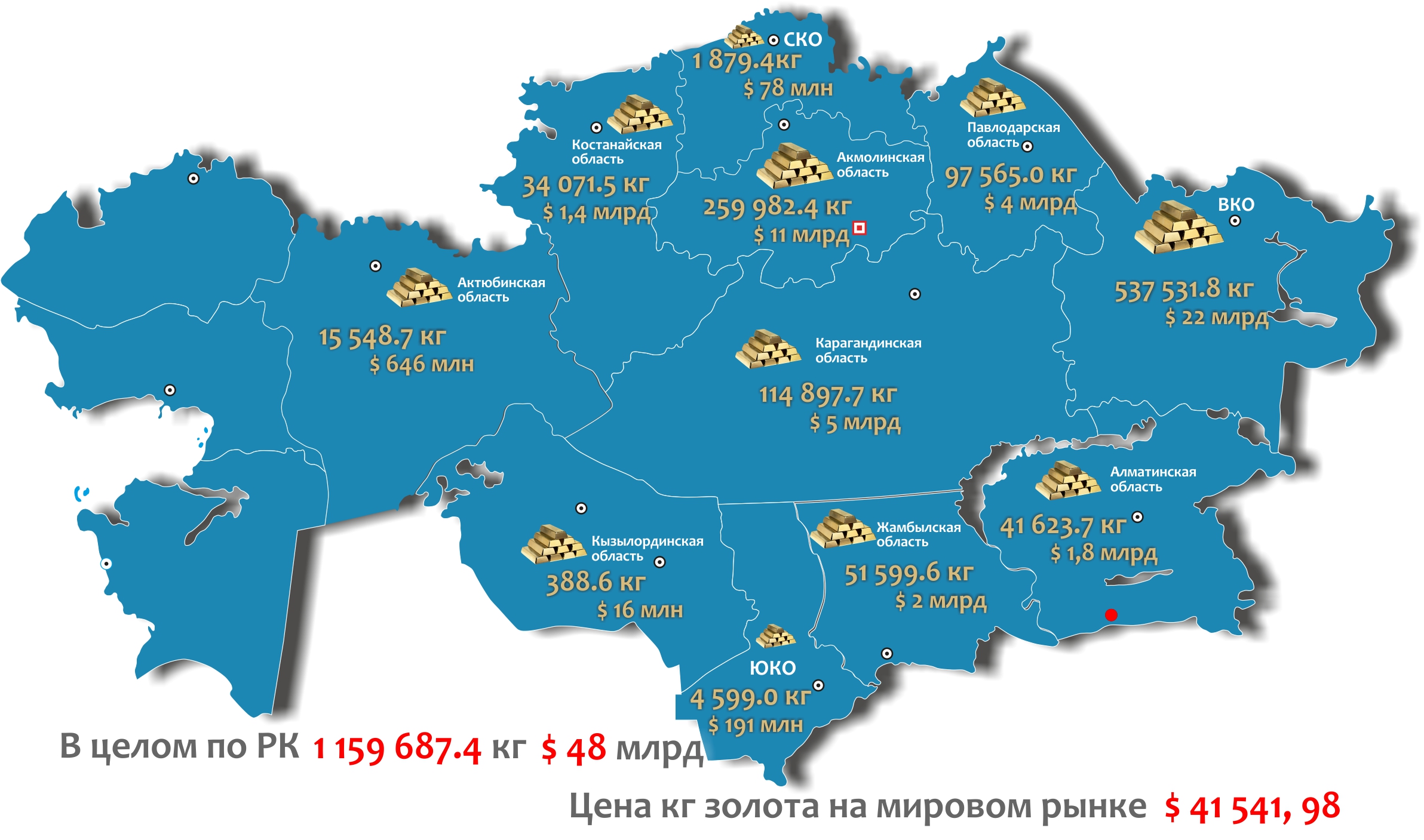 В целом все казахстанские месторождения с 1 159 687,4 килограммами золота оцениваются в 48 миллиардов долларов.