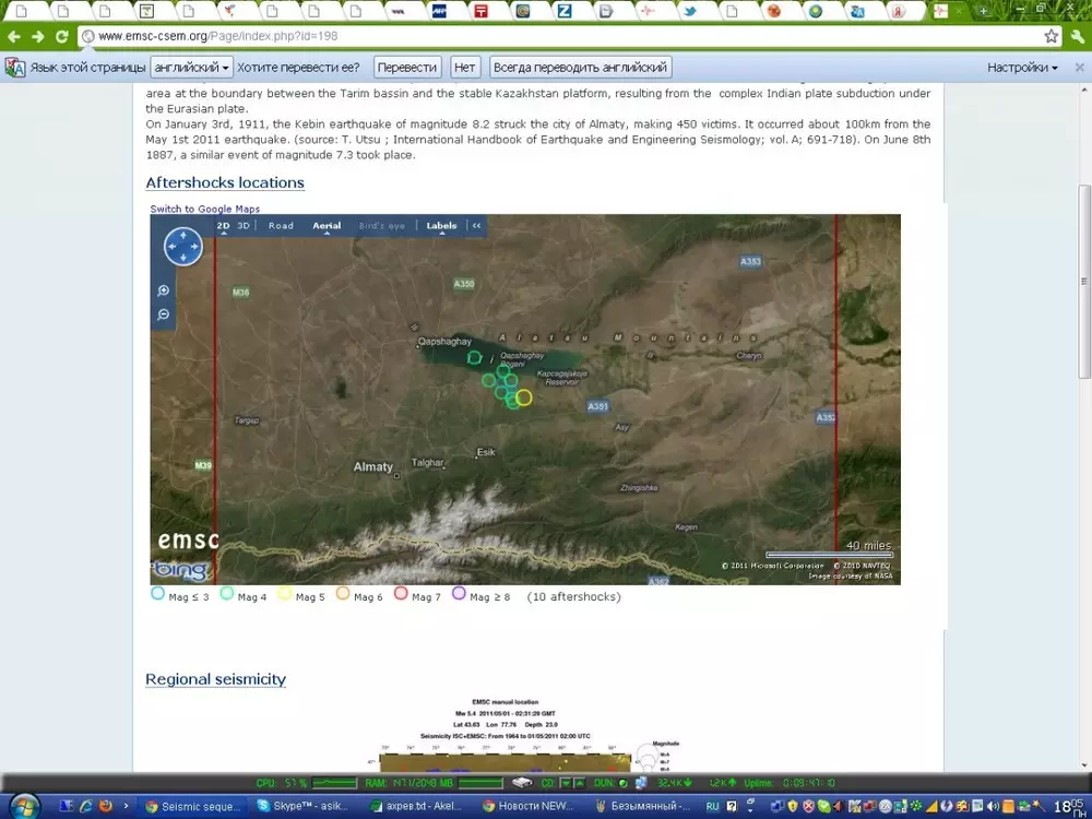 Специалисты Европейского сейсмологического центра (European-Mediterranean Seismological Centre) составили карту подземных толчков, зафиксированных под Алматы, передает корреспондент Tengrinews.kz. По данным центра, все землетрясения были зарегистрированы к северо-востоку от Алматы, причем эпицентр двух толчков находился непосредственно в Капчагайском водохранилище. Их магнитуда составила 4,9 и 4,7. Еще два вблизи водохранилища (4,0 и 4,2). Эпицентр еще трех землетрясений магнитудой более 4,0 был зафиксирован к северу от поселка Маловодное, в котором, по данным СМИ, оказались разрушены и повреждены некоторые здания. Сила двух других толчков составила около 3,0 баллов. Наиболее сильное землетрясение магнитудой 5,4 произошло 1 мая в 08.31 по местному времени, после которого и последовала серия афтершоков. В свою очередь, МЧС Казахстана не исключает, что в ближайшее время подземные толчки в Алматы будут продолжаться, но с уменьшающейся силой. Со своей стороны замначальника ДЧС Алматы Юрий Ильин заявил, что семибалльного землетрясения в 2011 году не ожидается, призвав граждан не паниковать.