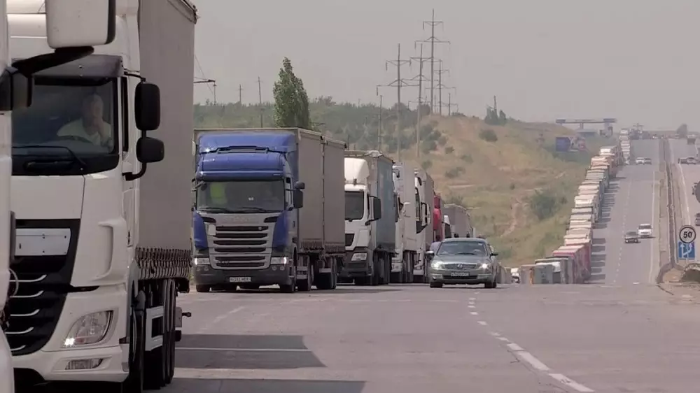 На трассе вблизи пункта пропуска "Казыгурт" растянулась многокилометровая пробка из фур. Водители грузовиков с товарами пытаются проехать в Узбекистан. Но вынуждены простаивать на казахстанской территории сутками.
