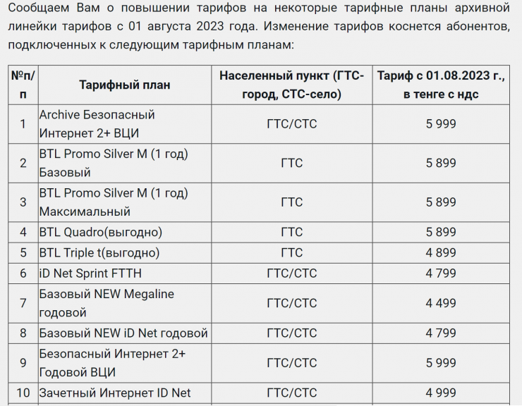 В "Казахтелекоме" повышение тарифов на некоторые тарифные планы архивной линейки тарифов планируется с 1 августа. Новые цены можно посмотреть здесь.