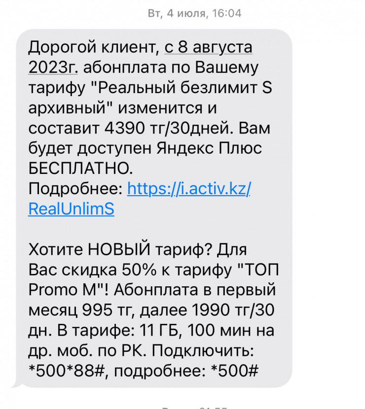 Как сообщается в рассылке Activ клиентам, абонентская плата изменится с 8 августа. Как пояснили в компании, с 8 августа обновится абонплата по тарифам "Реальный безлимит архивный", "Супер Комфорт архивный", "Беседа архивный". Новые расценки можно посмотреть здесь.