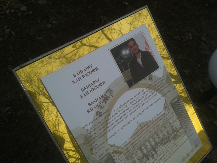Афганскому студенту Башарату хан Юсофи, который остановил неуправляемый трамвай во время ДТП в Алматы 13 октября 2015 года, присвоили звание "Гордость университета", передает корреспондент Tengrinews.kz. Памятную медаль и диплом вручил ректор Казахского национального медицинского университета имени Асфендиярова Айкан Аканов в рамках церемонии, посвященной 85-летию ВУЗа. Хан Юсефи был награжден наряду с такими выпускниками вуза, как личный врач космонавта Айдына Аимбетова Сауле Туруспекова и вице-премьер министр Кыргызстана Дамира Ниязалиева. Их имена сейчас размещены на табличках на специальной аллее вуза, называющейся "Успех года".