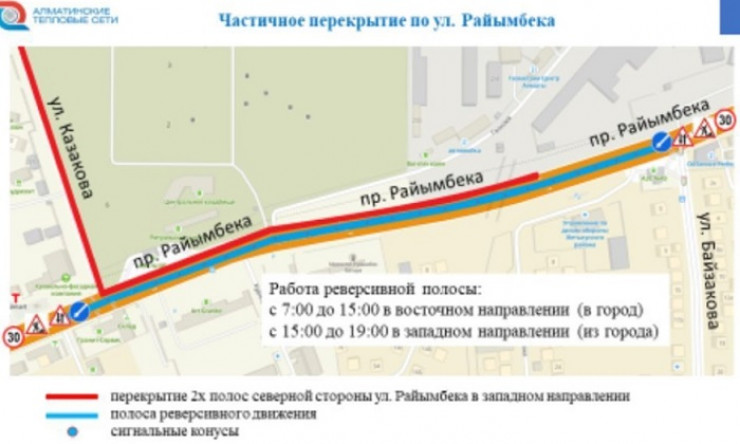 В Жетысуском районе Алматы в связи с ремонтом теплосетей с 00:00 28 июля по 10 августа будет закрыто движение для транспорта по проспекту Райымбека от улицы Байзакова до улицы Казакова в западном направлении, передает Tengrinews.kz со ссылкой на Almaty.tv.