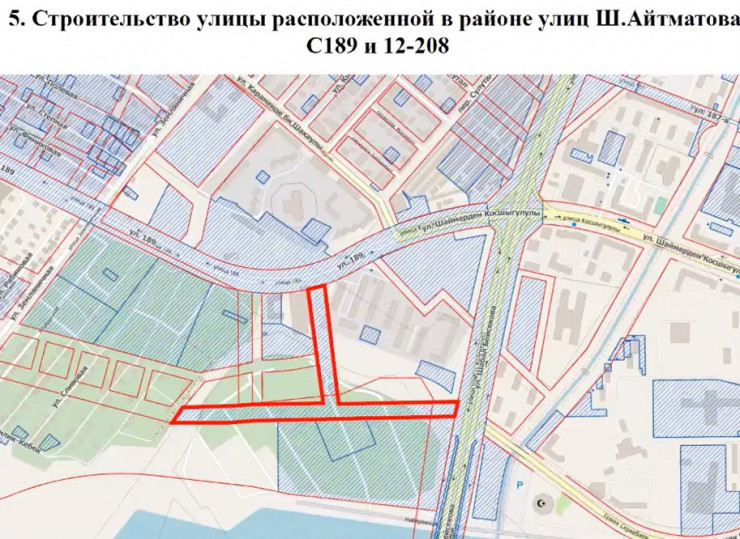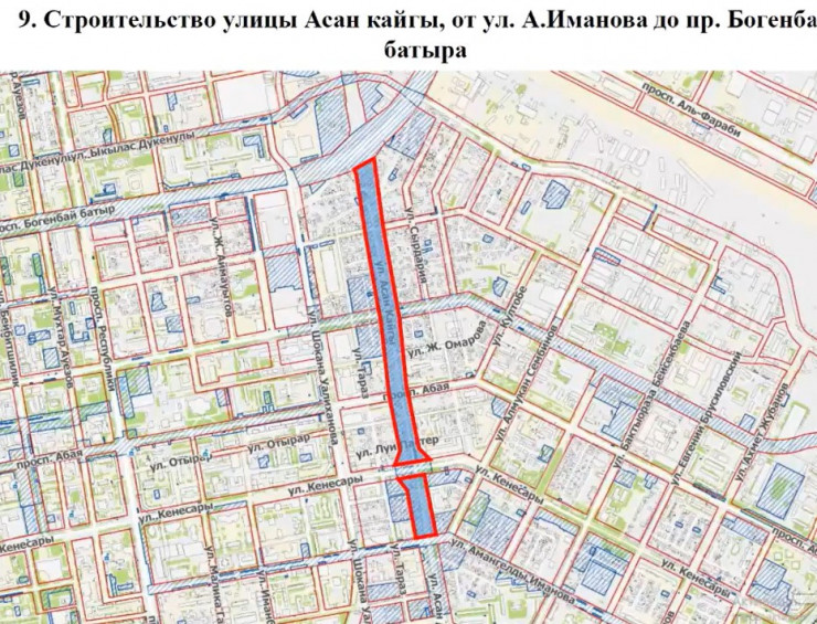 Также в городе появятся новые улицы: в районе пересечения улиц Айтматова, С189 и 12-208; на участке от улицы Шары Жиенкуловой до улицы Асан Кайгы; на участке от проспекта Тауелсиздик до улицы Токпанова; продолжение улицы Асан Кайгы на участке от улицы Иманова до проспекта Богенбай батыра.