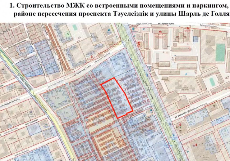 Например, новый многоквартирный жилой комплекс со встроенными помещениями и паркингом появится в районе пересечения проспекта Тауелсиздик и улицы Шарля де Голля.