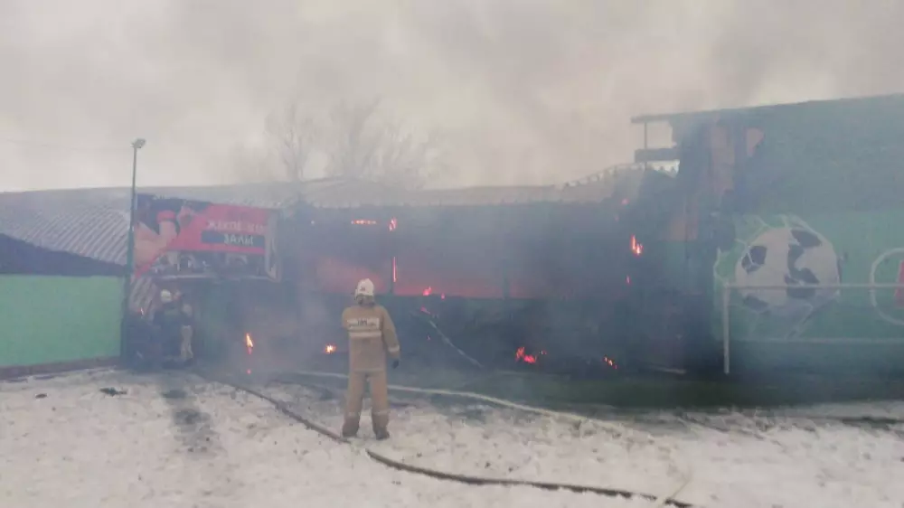 Сообщается, что силы и средства ДЧС города выехали на место в 7.55 утра по повышенному рангу вызова. Открытым пламенем горел спортзал ангарного типа одноэтажного спортивного комплекса "Медина".