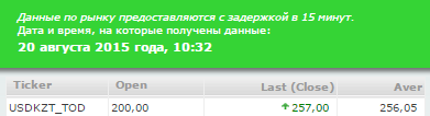 Средневзвешенный курс доллара на утренней сессии 20 августа 2015 года уже составляет 256 тенге, передает корреспондент Tengrinews.kz. Первая сделка утренней сессии, которая открылась в 10.15, прошла по цене в 200 тенге за доллар. Последняя сделка по состоянию на 10.32 состоялась по цене в 257 тенге. Отметим, торги еще продолжаются. Сессия завершается в 11.00. Как известно, Казахстан с сегодняшнего дня перешел к свободно плавающему обменному курсу. Как пояснил глава Нацбанка Кайрат Келимбетов, это означает, что финансовый регулятор уже не регулирует стоимость национальной валюты. Ее цену теперь определяет рынок.