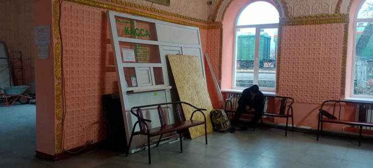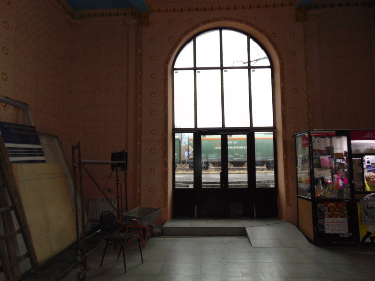 Внутри здания вокзала можно заметить строительные материалы. Сам вокзал продолжает функционировать.