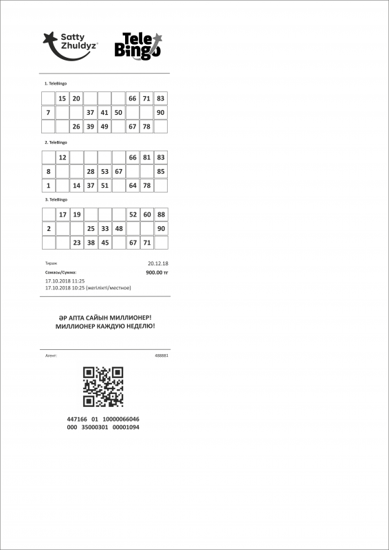 На сегодняшний день казахстанцам доступны тиражные лотереи "TeleBingo", "Keno", "777", "Loto 6/49", а также билеты моментальной лотереи "777". Лотерейные билеты моментальных игр "Жомарт 3", "Алтын", "3 Алмаза" в скором времени также появятся в продаже.