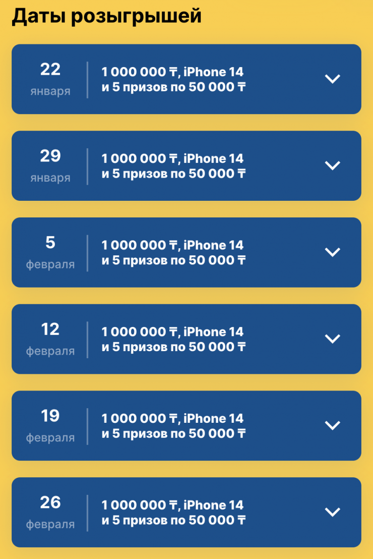 Розыгрыши будут проходить с 22 января по 26 февраля каждое воскресенье - в 19:45 на YouTube-канале Satty Zhuldyz будут разыграны iPhone 14 и пять призов по 50 тысяч тенге. А в 20:00 на кону 1 миллион тенге каждую неделю в эфире телеканала "31 канал".