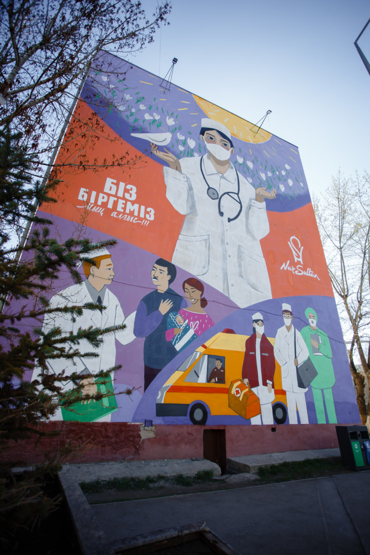 Изображение врачей появилось на фасаде жилого комплекса, расположенного на перекрестке проспекта Сарыарка и улицы Джангильдина. Как отмечается, с инициативой посвятить медработникам мурал вышло творческое сообщество столицы.