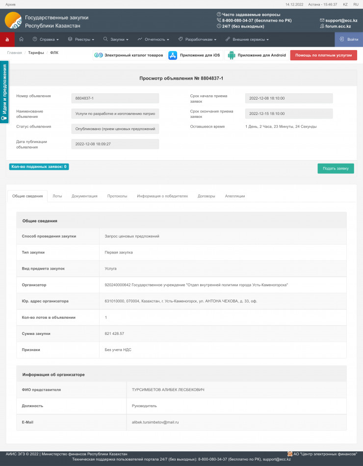 Об этом сообщается в объявлении на сайте госзакупок.