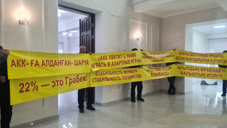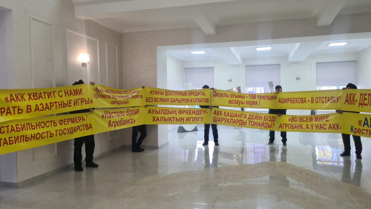 Актюбинские фермеры пришли в местный дом культуры с плакатами, передает корреспондент Tengrinews.kz.