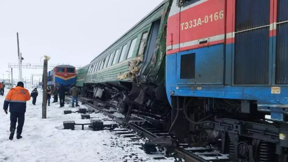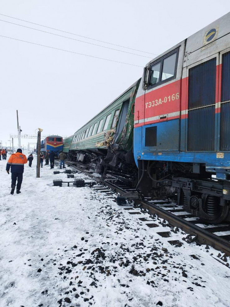 "Сегодня, 5 марта, ориентировочно в 10:30 в Актюбинской области, Шалкарский район, ж/д станция Бершугир, по предварительным данным, из-за бокового столкновения с маневровым локомотивом произошел сход тепловоза, вагона №1 и трех колесных пар вагона №2 пассажирского поезда № 317 сообщением Бишкек - Самара.
