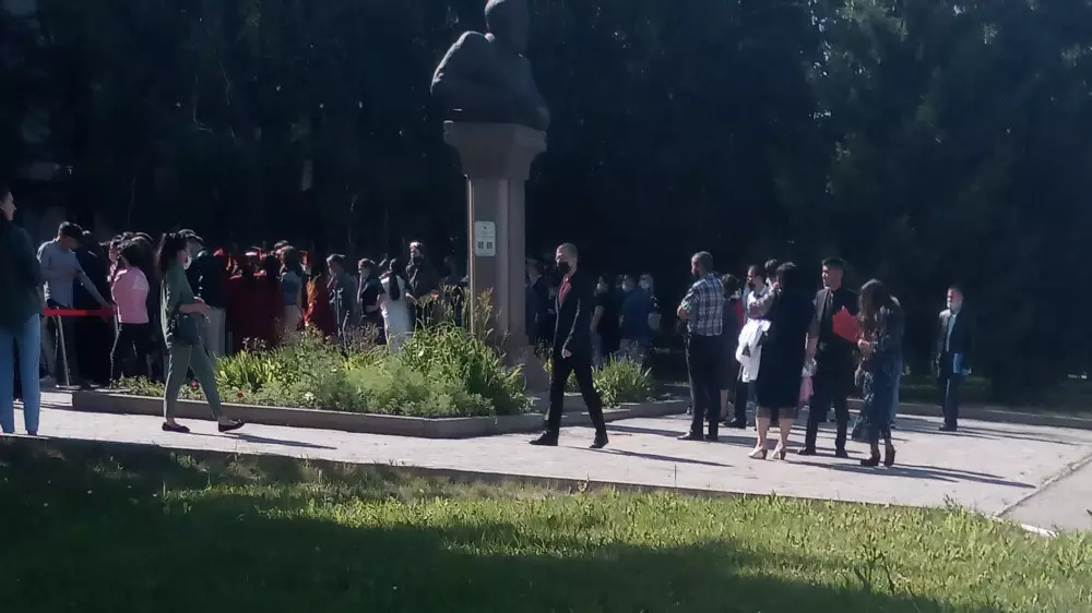 В университете прокомментировали причины возникновения толпы у входа в здание. "Получилось это из-за того, что прибыли студенты из районов, которые, согласно графику выдачи дипломов, не смогли приехать 1 и 2 июля в университет и забрать свой документ. Только сегодня у них получилось приехать в вуз. Вопрос был решен оперативно, выпускникам мы объяснили, что нужно обязательно соблюдать дистанцию и не нарушать правила дистанцирования", - сказала исполняющая обязанности проректора по воспитательной части Жанар Таласпаева.