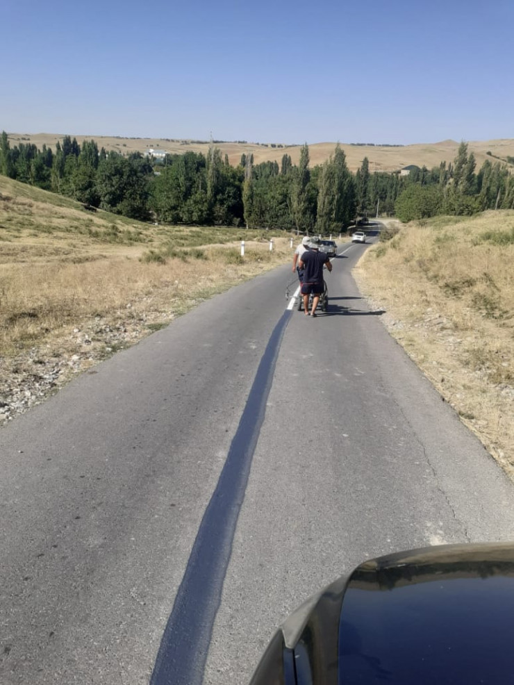 В акимате Туркестанской области заявили, что дорогу смыли весенние дожди, и предоставили фотографии работ по закраске разделительной полосы.