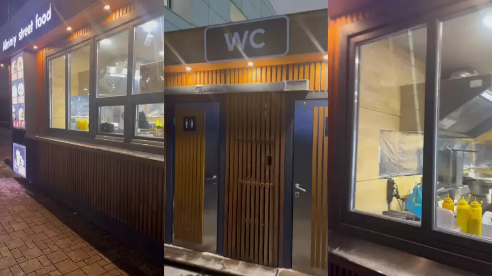 В редакцию прислали ролик, снятый в районе площади Абая перед Дворцом республики. На видео автор пытается отрыть дверь в общественный туалет, подобные которым ранее устанавливались в общественных местах Алматы, а затем показывает, что в туалете на деле размешается точка продажи стрит-фуда.