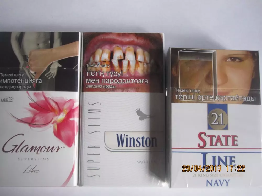 Соответствующее постановление правительства вступает в силу только 4 июля 2013 года, однако некоторые производители решили заранее поместить картинки на свою продукцию. Изображения предупреждают курильщика о том, что употребление табака ведет к смертельным болезням, провоцирует импотенцию, вызывает наркотическую зависимость и вредит здоровью плода курящей матери. Картинки размещены в верхней части пачки, чтобы сразу привлекать внимание покупателя, и чтобы он не мог закрыть их рукой. На лицевой стороне пачки размещены предупреждающие надписи на казахском языке, а на обратной стороне - на русском.