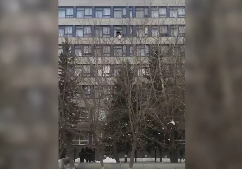 Инцидент произошел днем 23 января. На кадрах, распространившихся в соцсетях, можно рассмотреть, как парня в белой рубашке пытаются удержать и затащить обратно в аудиторию. Тот, судя по всему, сопротивляется и в конце концов падает вниз.