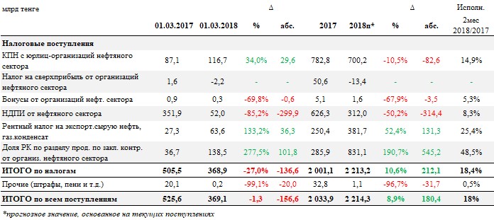 "За аналогичный период прошлого года поступления были равны 505,5 миллиарда тенге. Столь объемные поступления в прошлом году были в первую очередь связаны с аномально большими поступлениями НДПИ в январе - 318,72 миллиарда тенге или более половины поступлений по данной статье за весь прошлый год. В этом году поступления НДПИ оказались скромнее и ближе к историческим средним значениям - 52 миллиарда тенге за два месяца. Положительными же тенденциями в текущем году являются увеличение поступлений КПН на 34 процента, рентного налога на 133,2 процента и рост доли РК по разделу продукции на 101,8 миллиарда тенге, до 138,5 миллиарда тенге", - поясняют в Ассоциации финансистов Казахстана.