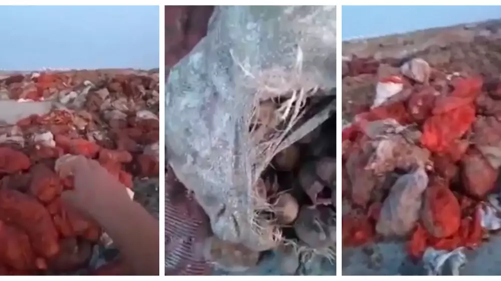 На кадрах видны мешки разбросанных продуктов: картофеля, лука, капусты. Все это находилось на территории компании "Ибрайхан ЛТД", занимающейся утилизацией отходов.