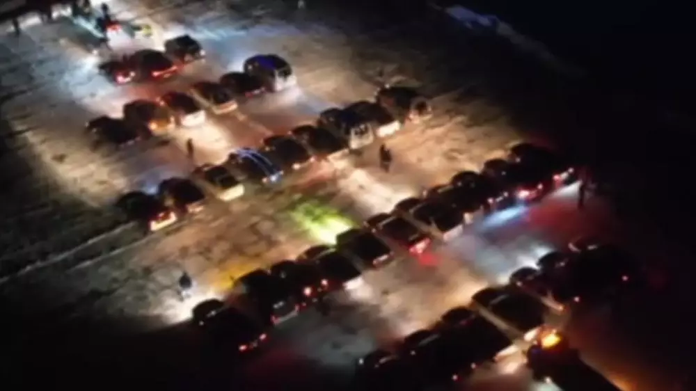 Украшенные гирляндами, мишурой, сверкающие разными цветами машины начали выстраивать засветло. Конечный результат сняли на видео в темное время суток. Позже ролик появился в соцсетях, в паблике kris_p_talgar.