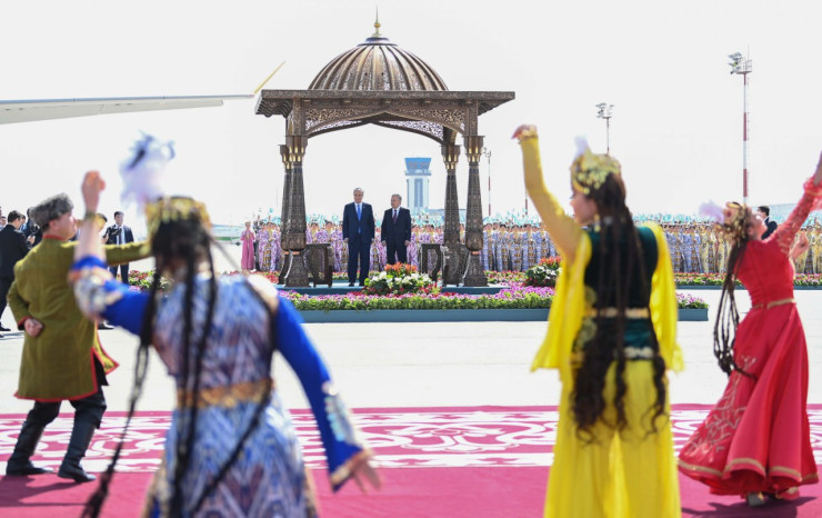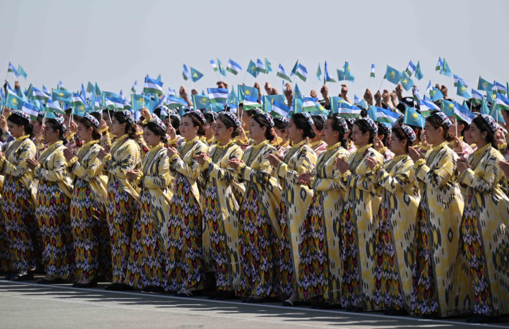 Десятки женщин в национальных нарядах с флагами Узбекистана приветствовали президентов Токаева и Мирзиеева.