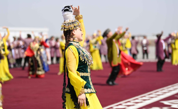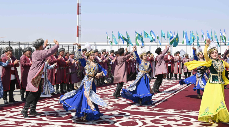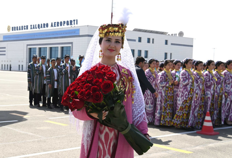 На территории аэропорта Ургенча растелили огромные ковры. Мужчины и женщины исполнили узбекские танцы. В это время на крыше одного из зданий музыканты играли на национальном инструменте карнай.