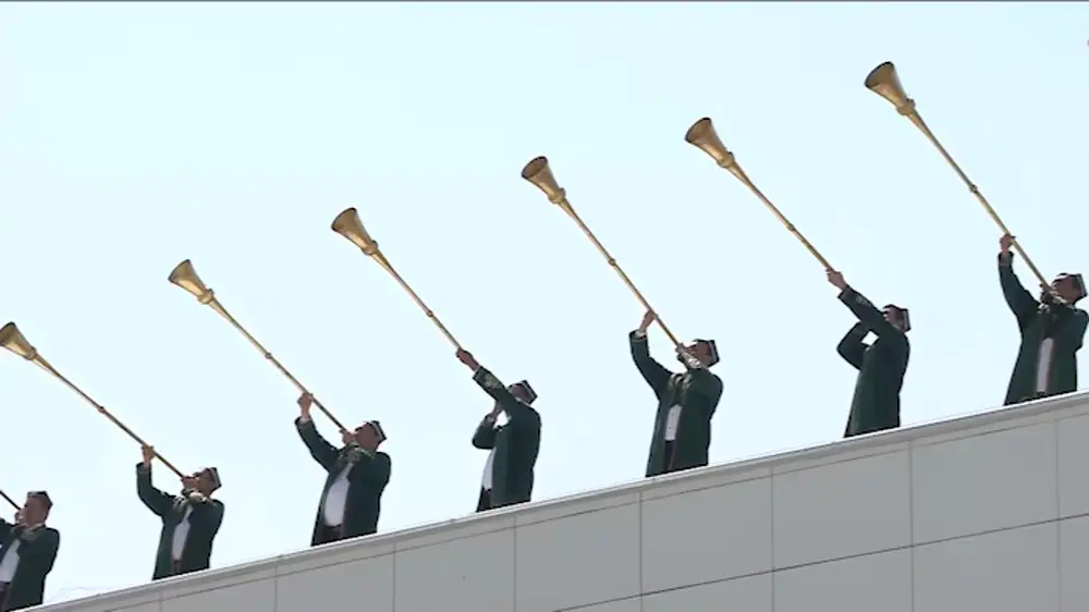 На территории аэропорта Ургенча растелили огромные ковры. Мужчины и женщины исполнили узбекские танцы. В это время на крыше одного из зданий музыканты играли на национальном инструменте карнай.