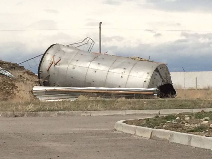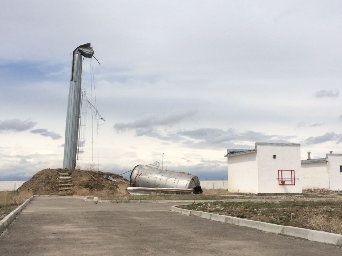 Между тем, порывами ветра опрокинуло водонапорную башню туберкулезной больницы в Байзакском районе Жамбылской области.