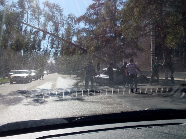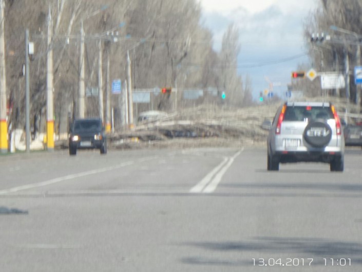 12 апреля с вечера в областном центре начался сильнейшей ливень. Ночью дождь прекратился и к утру поднялся ветер. В городе повалено несколько деревьев. Огромный карагач перекрыл движение по проспекту Абая. В некоторых районах города наблюдаются перебои с энергоснабжением. Не работают некоторые светофоры.