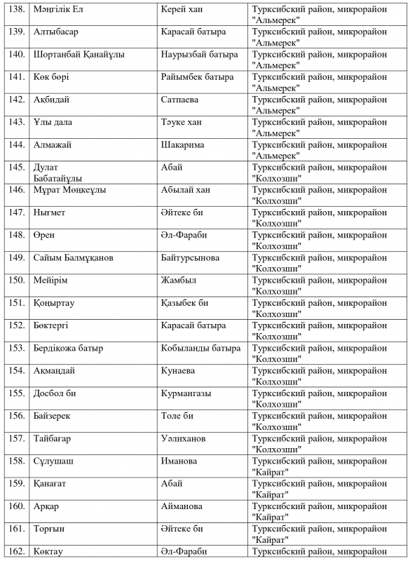 Как стало известно, улицам присвоят имена знаменитых правителей Казахского ханства - Тауке хана, Керей и Жанибек ханов (Керей, Жәнібек хандар), фамилии актеров театра и кино Фариды Шариповой и Кумана Тастанбекова, писателя Абиша Кекильбаева, ученого Василия Бартольда и других.