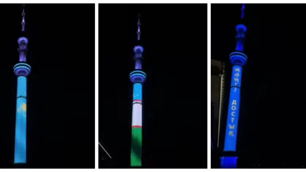 Телебашня Кок-Тобе окрасилась в цвета флагов Казахстана и Узбекистана Кадры из видео