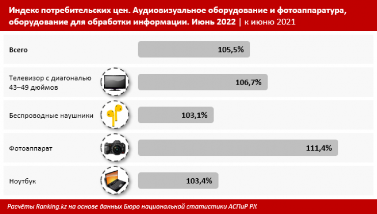 По итогам июня текущего года стоимость аудиовизуального оборудования и фотоаппаратуры, а также оборудования для обработки информации выросла за месяц на 4,4 процента, за год - на 5,5 процента.