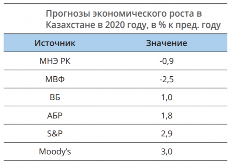 Есть и другой прогноз. По оценкам рейтинговых агентств S&P и Moody’s, экономика Казахстана за 2020 год может сохранить положительный прирост на уровне 2,9-3 процента. А по ожиданиям международных финансовых организаций - Азиатского банка развития и Всемирного банка - данный показатель будет не меньше 1-1,8 процента.