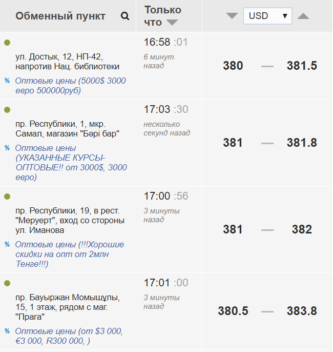 В обменных пунктах Нур-Султана и Алматы, по данным kurs.kz, американскую валюту продают от 381,5 до 383,8 тенге.