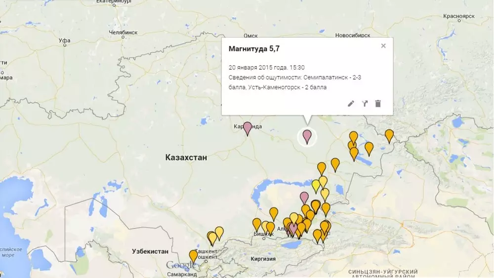 Также на карте можно увидеть скопление очагов землетрясений на границе с Китаем, севернее села Сарыбастау. Там расположены пять эпицентров, все толчки в этой местности были относительно слабыми - магнитудой от 3,5 до 4,9. Ощутимые подземные толчки были зафиксированы в восточной части страны, там на карте можно найти скопление пяти меток возле озер Зайсан и Маркаколь. Кроме того, сильные землетрясения происходили вблизи больших городов. Например, 20 января 2015 года в 200 километрах от Семея произошло землетрясение магнитудой 5,7, в городе оно ощущалось силой в 2-3 балла. Также можно отметить серию подземных толчков под Карагандой, которые произошли 21 июня 2014 года. Магнитуда в эпицентре толчков составила 5,8, в областном центре они ощущались силой в 4 балла. Сейсмическая волна докатилась до Астаны, где жители почувствовали колебания силой в 2 балла.