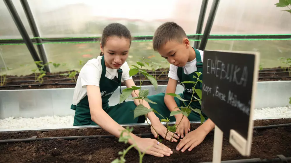 Экологический проект для детей "Зеленая школа" стартовал в 16 государственных школах Алматы, где фонд построил теплицы с умными системами капельного полива, освещения и отопления, а для учеников и учителей выпустил учебники с пошаговой инструкцией, как ухаживать за растениями.