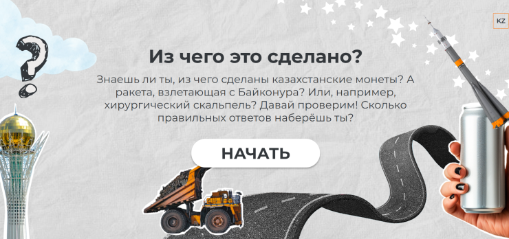 Ответы на эти вопросы можно найти, пройдя познавательный тест "Из чего это сделано?", реализованный при поддержке группы компаний ERG. В нем также можно узнать, из чего сделана конструкция символа Астаны Байтерека или космическая ракета, взлетающая с Байконура. Стоит отметить, что среди тех, кто прошел тест, уже есть знатоки, набравшие 10 из 10 баллов.