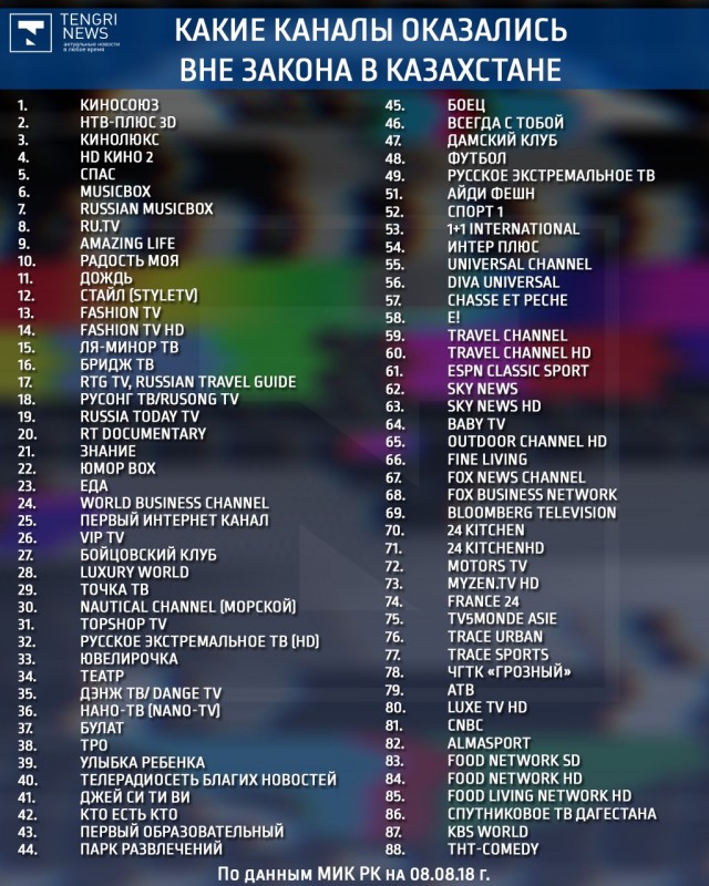 "По истечении указанного срока, министерство у всех иностранных теле-, радиоканалов, не прошедших процедуру регистрации юридического лица или учетной регистрации филиала (представительства), отозвало свидетельство о постановке на учет. Что в последующем повлечет запрет на ретрансляцию данных иностранных теле-, радиоканалов на территории Казахстана", - говорится в сообщении МИК.