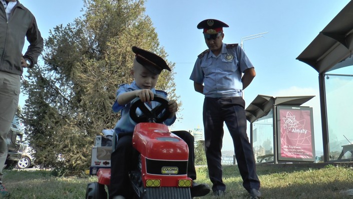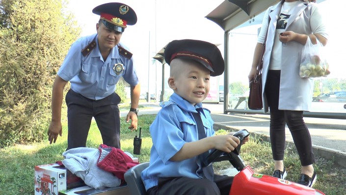 Мальчику вручили и собственный игрушечный автомобиль, на котором Адилет может лично патрулировать территорию своего двора.