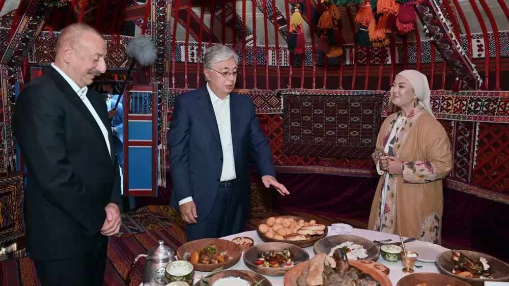 Сообщается, что лидеры Казахстана и Азербайджана осмотрели набережную Каспийского моря, а также посетили установленную здесь казахскую юрту.