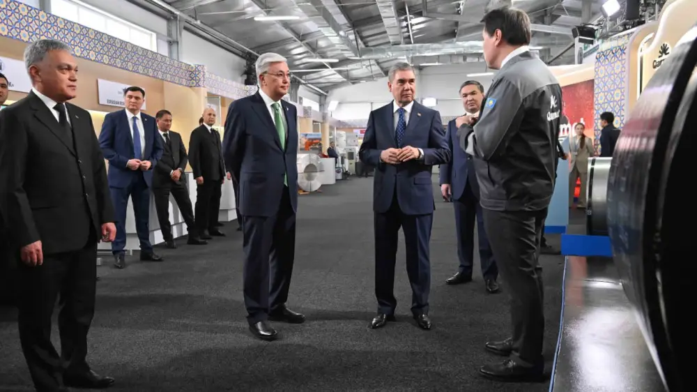 Касым-Жомарт Токаев и Гурбангулы Бердымухамедов ознакомились с выставкой казахстанских производителей, представляющих космическую отрасль, машиностроение, металлургию, строительную индустрию, легкую, пищевую и химическую промышленность.